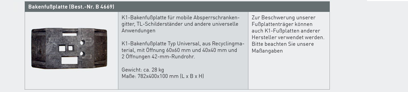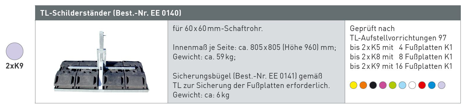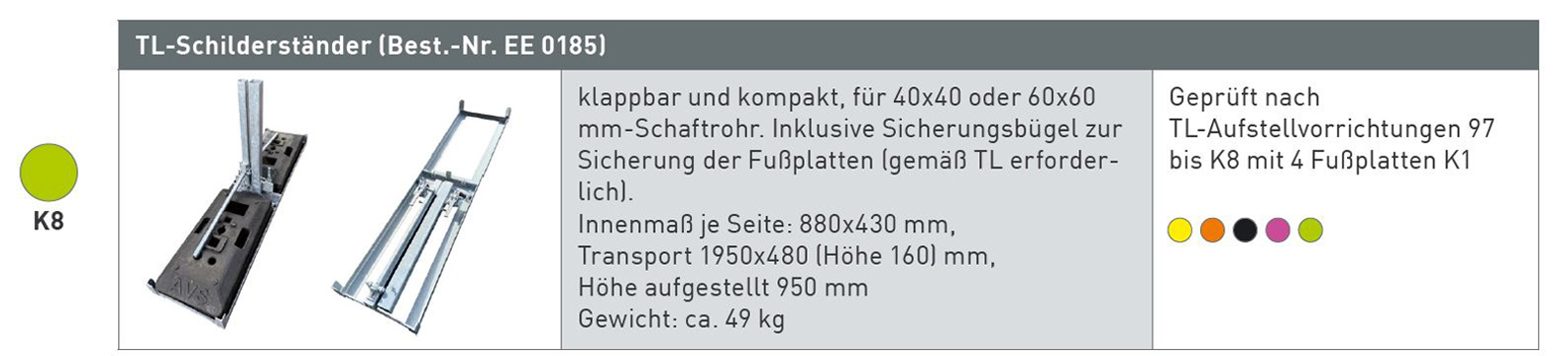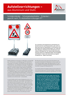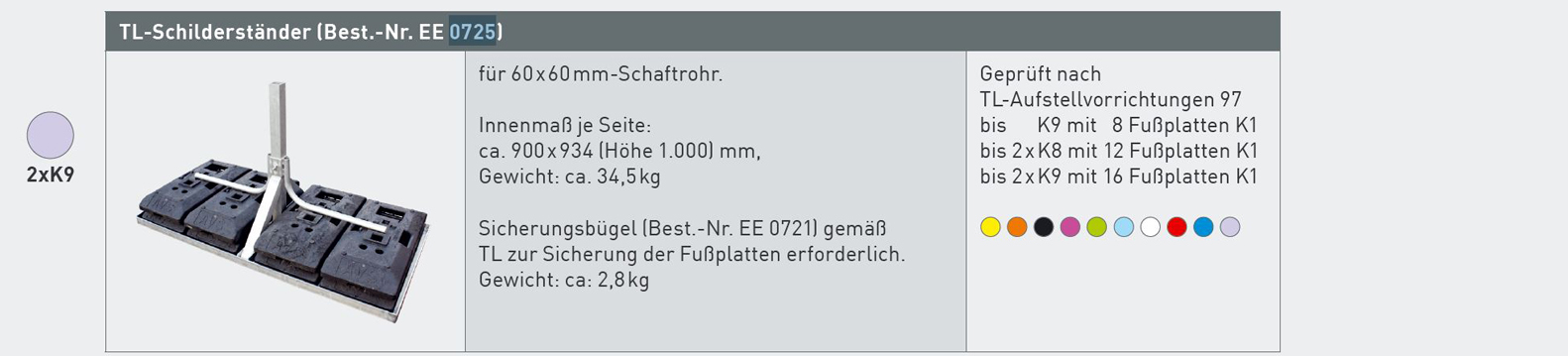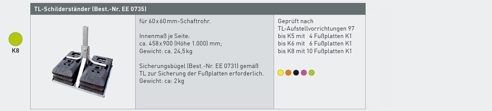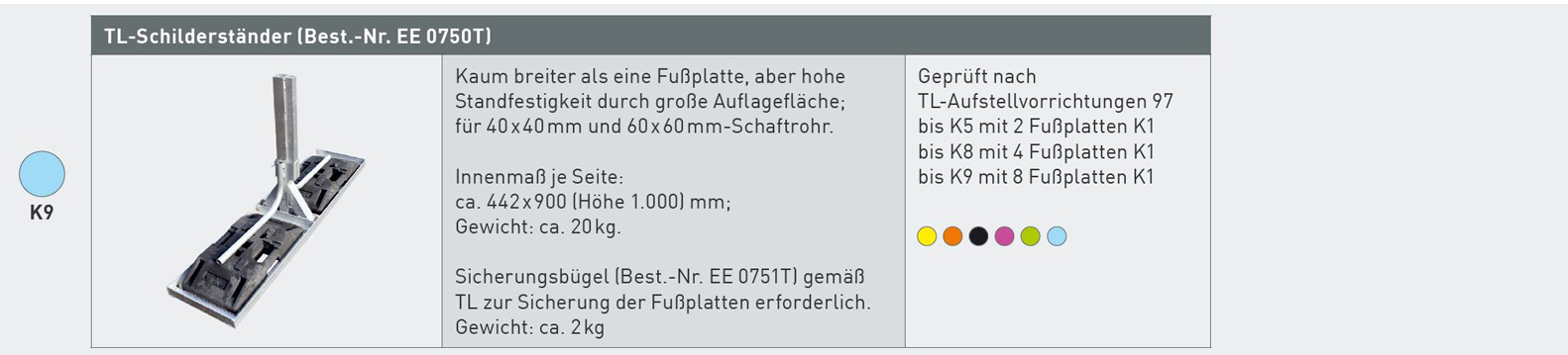 Mobile Aufstellvorrichtungen von Berghaus sind gemäß den „Technischen Lieferbedingungen für Aufstellvorrichtungen für Schilder und Verkehrseinrichtungen an Arbeitsstellen“ (TL-Aufstellvorrichtungen 97) gefertigt und durch einen IfS-zertifizierten Sachverständigen geprüft. Die dem Produkt zugeordneten Standsicherheitsklassen sind einfach auf dem jeweiligen Typenschild abzulesen. So ist es ein Leichtes den passenden TL-Fußplattenträger (auch Schilderständer genannt) und die, für die benötigte Standfestigkeit, erforderliche Anzahl Fußplatten auszusuchen um schnell und sicher Verkehrszeichen gemäß den Richtlinien „gut sichtbar, standfest und verdrehsicher“ aufzustellen.