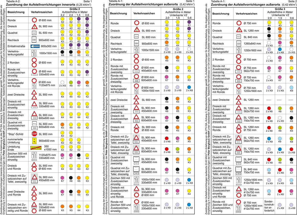 Je nach Größe und Art sowie Kombination der zu errichtenden Schilder, der notwendigen Aufstellhöhe und dem gewünschten Einsatzort inner- oder außerorts, muss eine entsprechende Aufstellvorrichtung ausgewählt werden. Hierzu wurden für Fußplatten und Träger Standsicherheitsklassen (K) eingeführt und in den „Zusätzlichen Technischen Vertragsbedingungen und Richtlinien für Sicherungsarbeiten an Straßen“ (ZTVSA 97 Anhang 3) bildliche Übersichten mit verschiedenen Verkehrszeichen zur Einordnung erstellt.