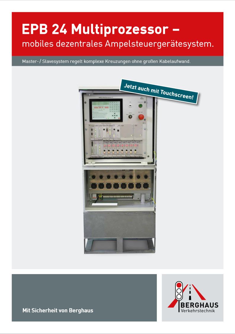 Das mobile Ampel-Steuergerätesystem EPB 24 Multiprozessor regelt mit minimalem Zeit- und Kabelaufwand temporäre Groß-Kreuzungssignalanlagen. So können mit den Master- und Slave-Steuergeräten der EPB 24-Serie bis zu 24 Signalgruppen mit maximal 48 Leistungskarten für 96 dreifeldrige, vollüberwachte LED-Ampelsignalgeber dezentral angesteuert werden. Die Programmierung erfolgt über PC oder Laptop menügeführt mit AmpelTools in grafischer Form. Zur Kontrolle und als Nachweis können alle erforderlichen signaltechnischen Unterlagen direkt aus dem Steuergerät ausgedruckt werden.