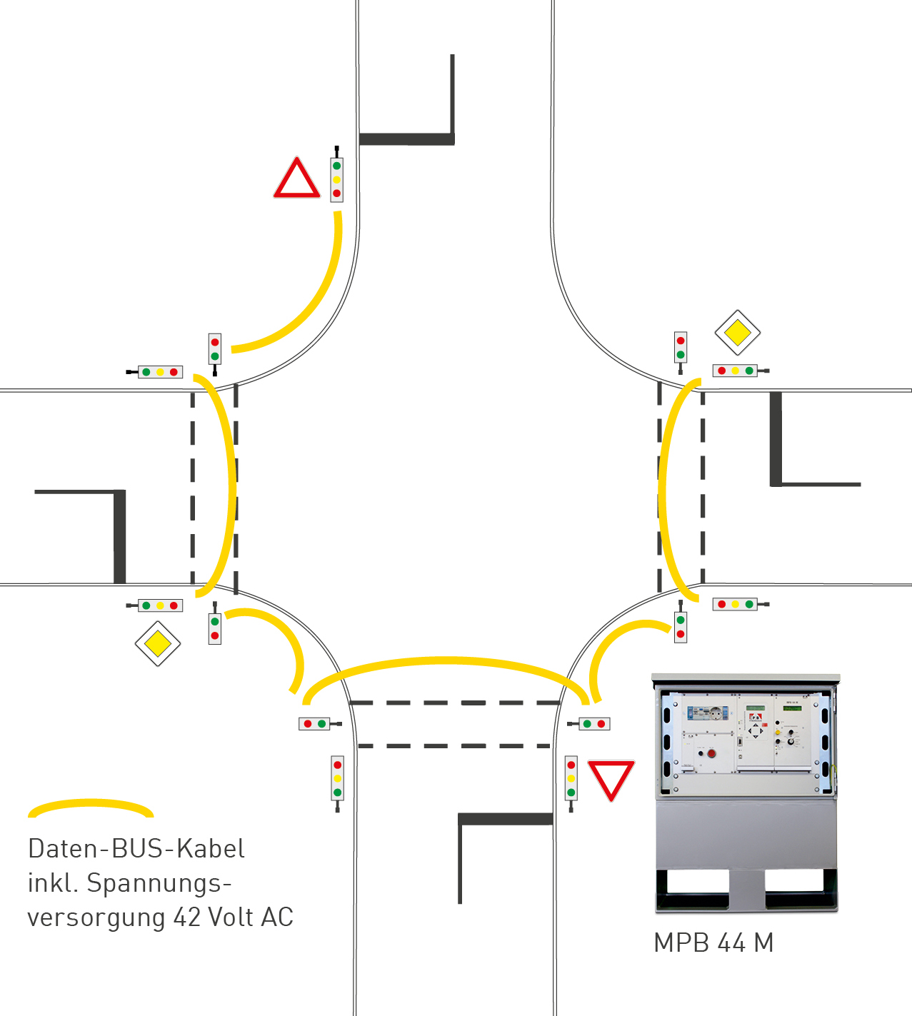Alle Ampelköpfe sind jeweils mit einer eigenen Steuerplatine ausgestattet, die auch die an-geschlossenen Zusatzeinrichtungen erfasst. Alle Signale werden zentral vom MPB 44-Master-Steuergerät per Datenbus angesteuert.