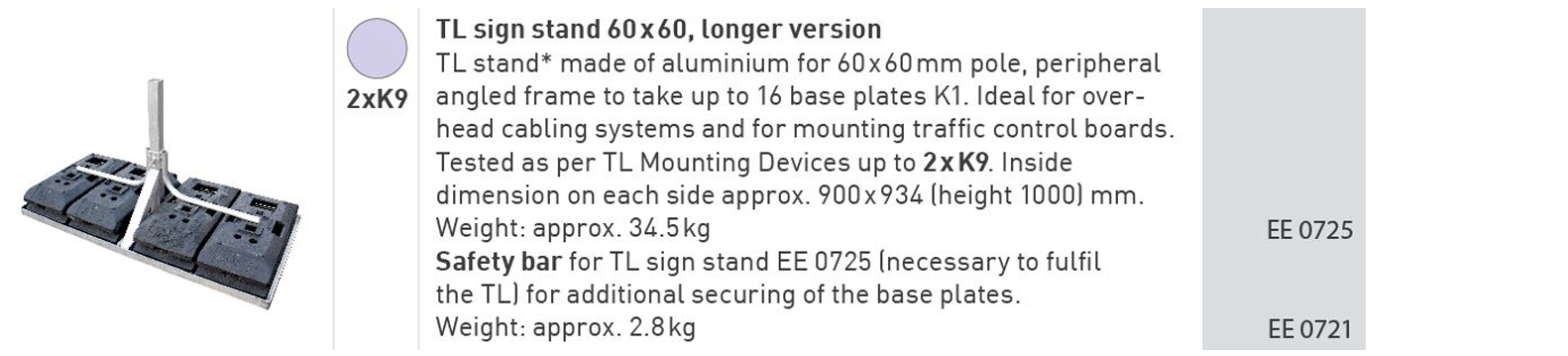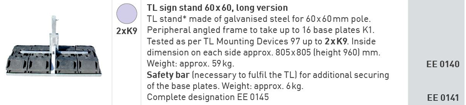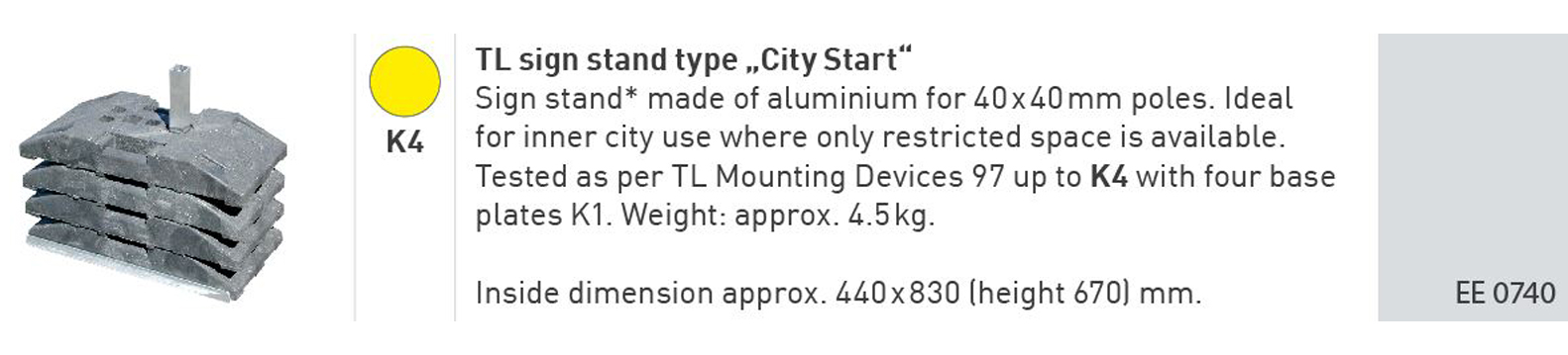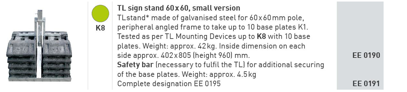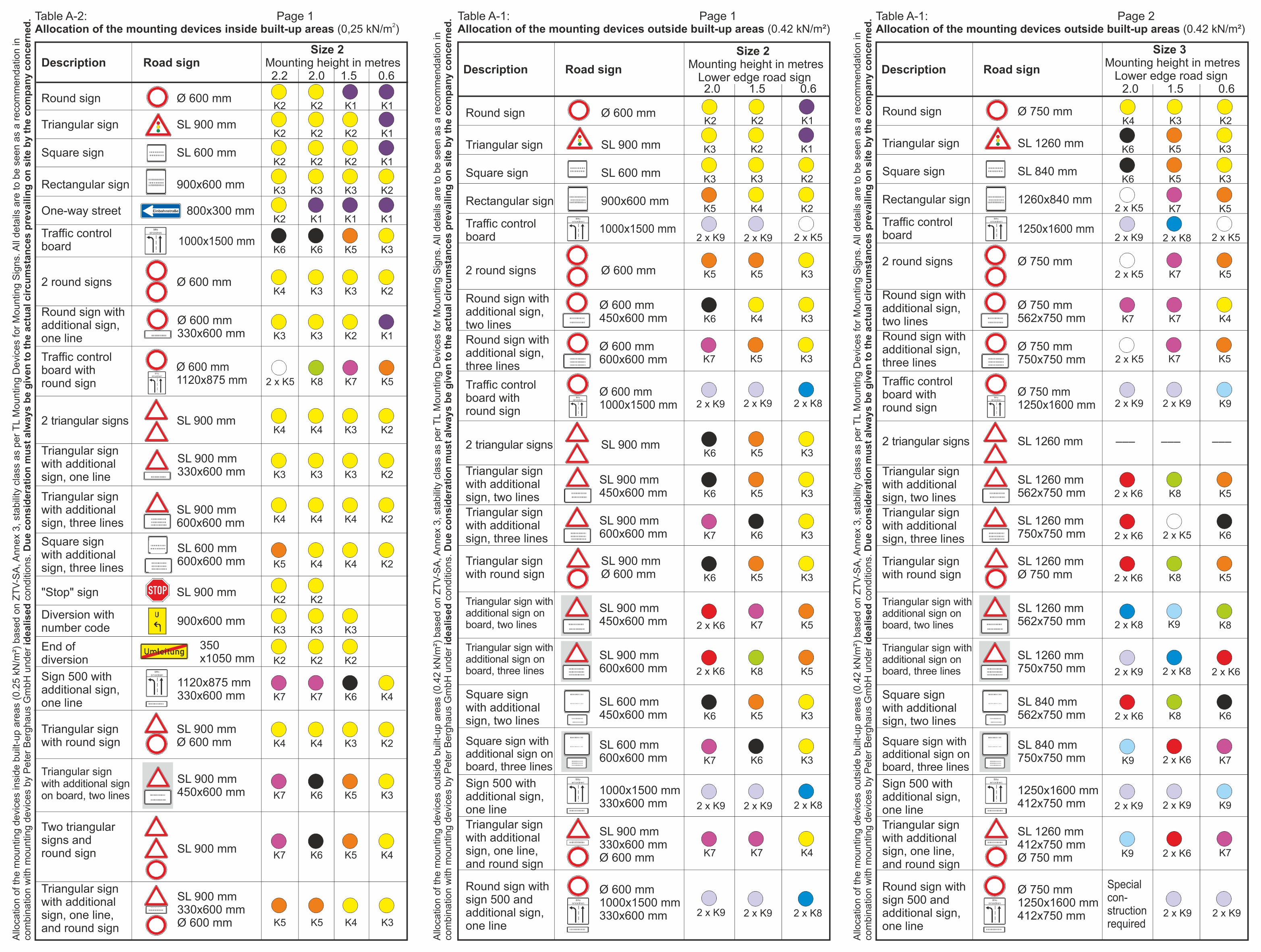 Have you ever been uncertain which TL sign stand you should select and how many K1 base plates you need for safe and stable mounting of mobile road signs? While the ZTV-SAgives clear stipulations for road sign size and mounting height for use inside and outside built-up areas, it is often difficult to put the official table into practice. This is why we have colour-coded our sign stands to allocate them to the entries in the table, as you can see on the next few pages. By the way, higher stand classes include lower classes. For example, a K8 sign stand (green dot in the table) can also be used to mount road signs marked in our allocation with a purple, black, orange or yellow dot. This then helps you to always choose the right TL mounting device from our product range.
