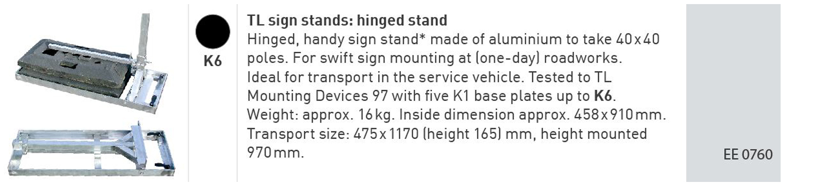 The large round and lattice aluminium masts have also undergone structural analysis testing. All steel or aluminium sign stands are marked according to the TL Mounting Devices. The tested stability safety classes attributed to the product (K) are obvious at a glance. This makes it easy to erect signs and road systems with all due stability quickly and safely according to the TL.