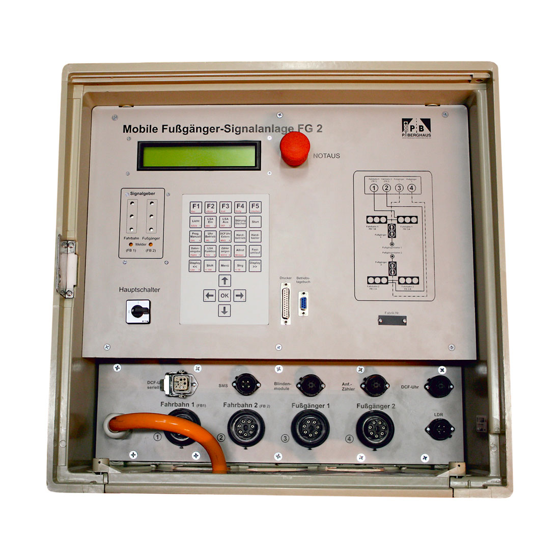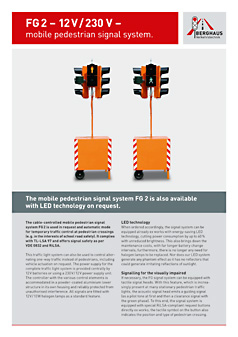 The cable-controlled mobile pedestrian signal system FG2 is used in request and automatic mode for temporary traffic control at pedestrian crossings (e.g. in the interests of school road safety).